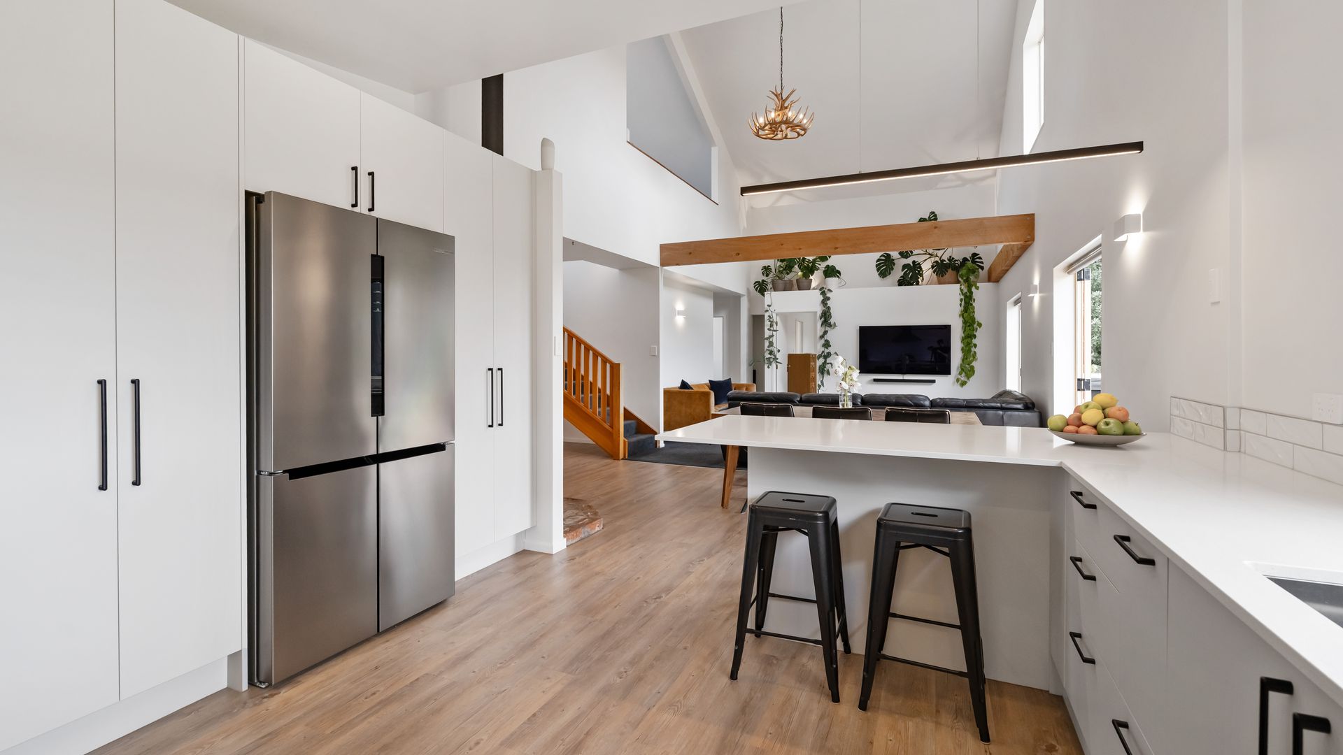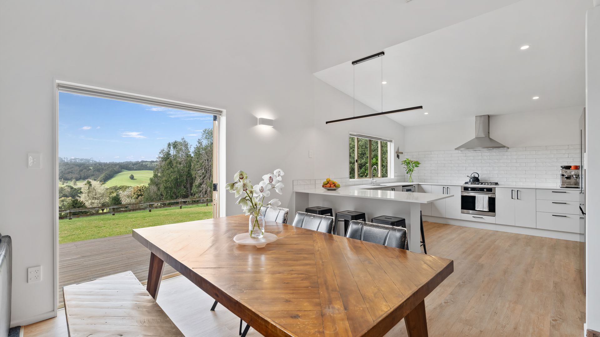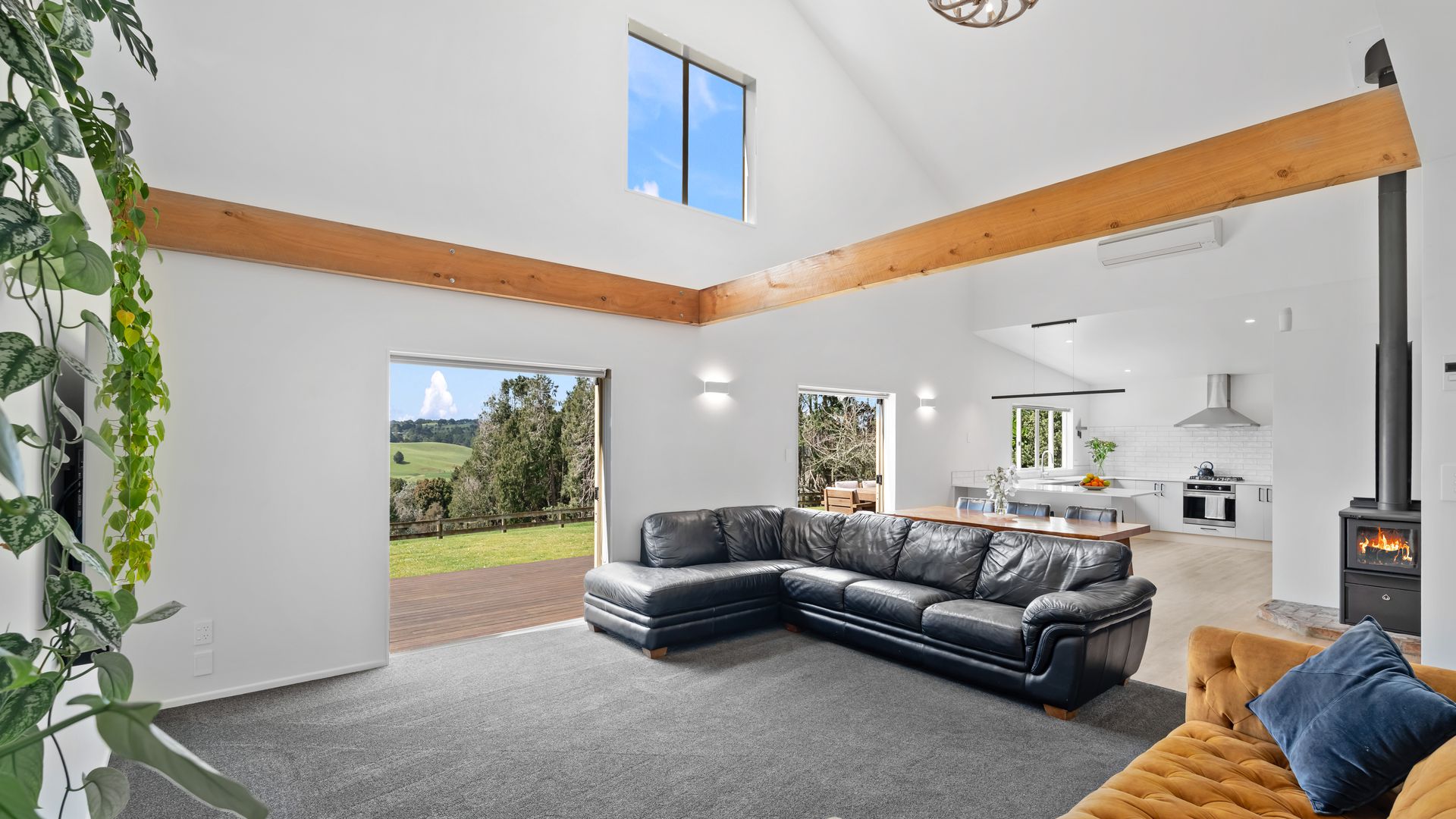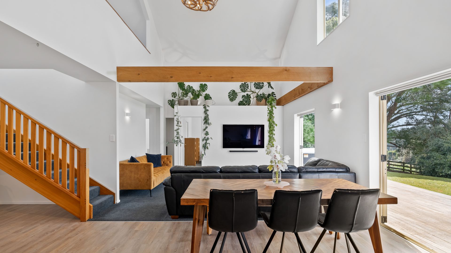 Whangarei country living - without the long commute. Located midway between Maunu and Kamo, this modern barn-style haven pairs everyday ease with a gorgeous outlook. Inside, soaring ceilings with warm timber beams create a dramatic central living zone, anchored by a sleek white kitchen with a generous breakfast bar, quality appliances and effortless flow to open plan lounge and dining area. Throw the doors wide and life shifts outdoors: a sheltered patio for year-round BBQs that doubles as a car port, a sun-soaked deck for long lunches, and a spa spot to watch the hills fade into evening.